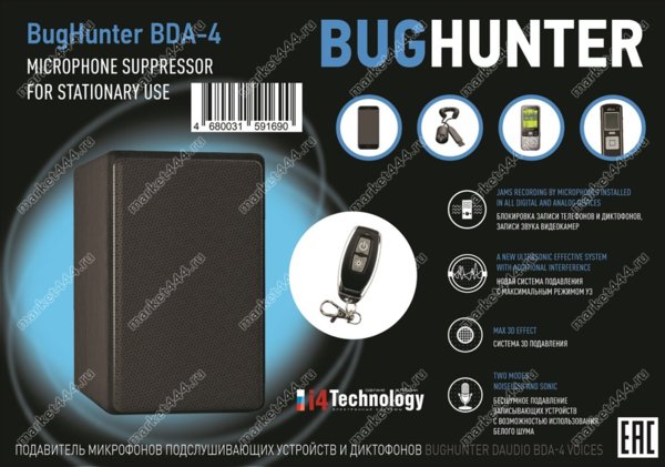 Работа устройства ""BugHunter Daudio bda-4"" основана на современном микропроцессоре, а также на фирменном авторском алгоритме, который отвечает за генерацию УЗ излучения. Алгоритм рассчитывает форму сигнала, видоизменяет ее, делая работу подавителя очень эффективной даже против современных записывающих устройств и микрофонов. В дополнение к УЗ излучению подавитель использует акустическую речеподобную помеху, громкость которой регулируется пользователем самостоятельно.